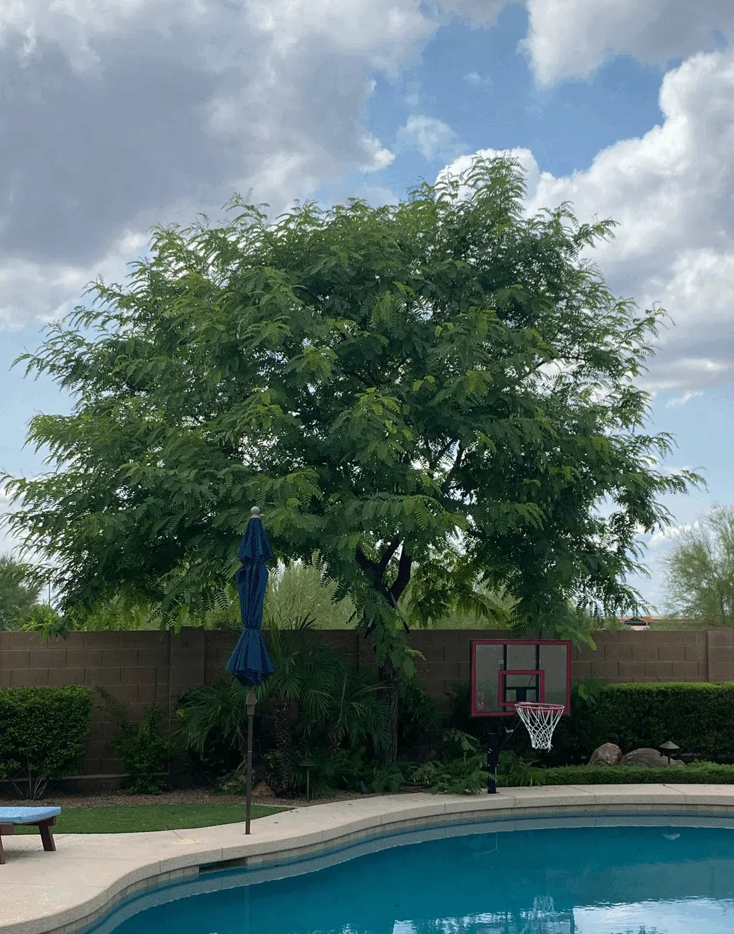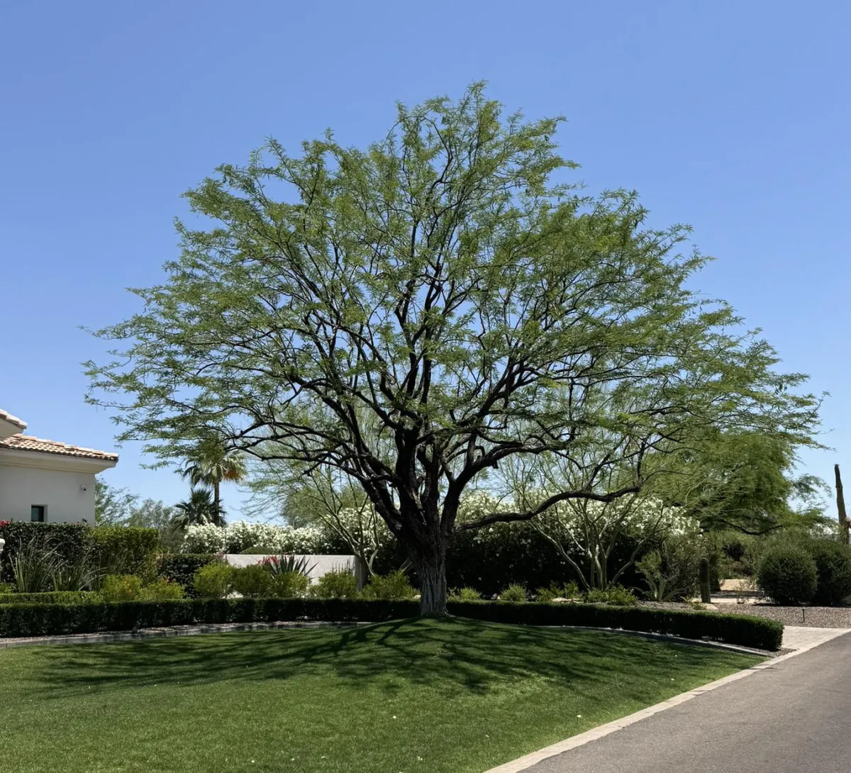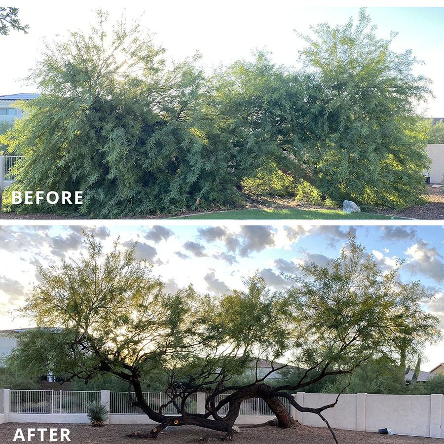 Instead of removing after storm damage we rescued this fallen Mesquite and transformed it into a beautiful multitrunked backyard feature.